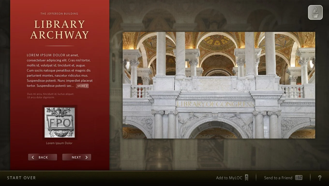 We designed a digital experience that echoed the elegance of the hall itself, drawing on its classic architecture, tile work, and motifs. My retouching work seamlessly merged multiple raw photographs into a single, continuous image, allowing users to pan and zoom across it without distraction. A simple interface with intuitive tools made it easy for anyone to explore, while discreet callouts highlighted details of interest. Clicking on a callout revealed close-up photography and explanatory text, guiding visitors through the hidden artistry of the space.